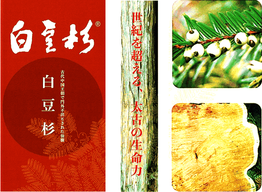 万里の長城を作ったことでも有名な始皇帝は、中国統一という偉業を成し遂げたあと、不老不死を夢見るようになります。始皇帝から命を受けた徐福をはじめとする臣下は、世界中を旅しながら、見つけ出したものの一つが白豆杉と言われ、仙人になれる仙樹とも呼ばれる由緑です。